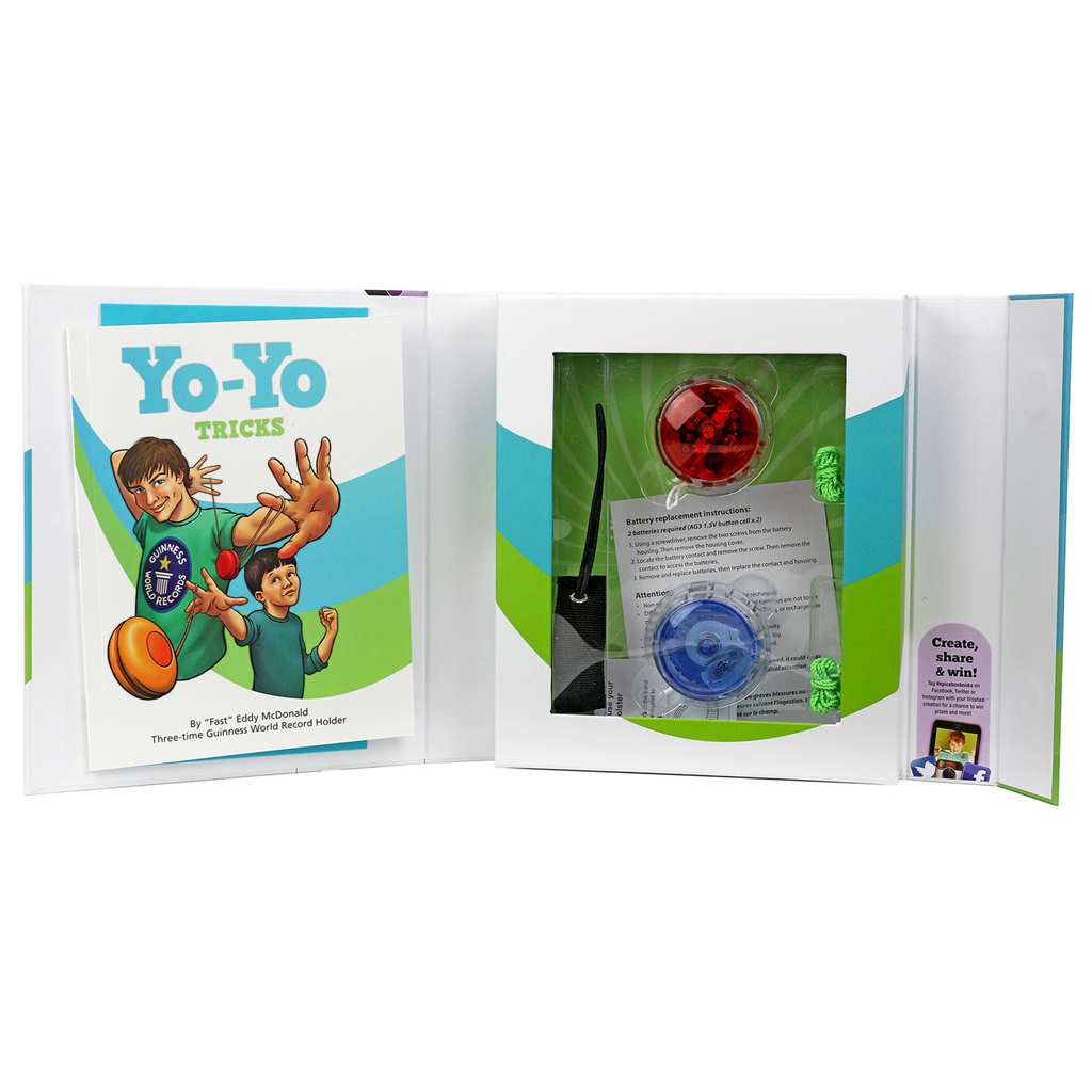 Includes instructional book, beginner yo-yo, trick yo-yo, replacement strings, and a holster.